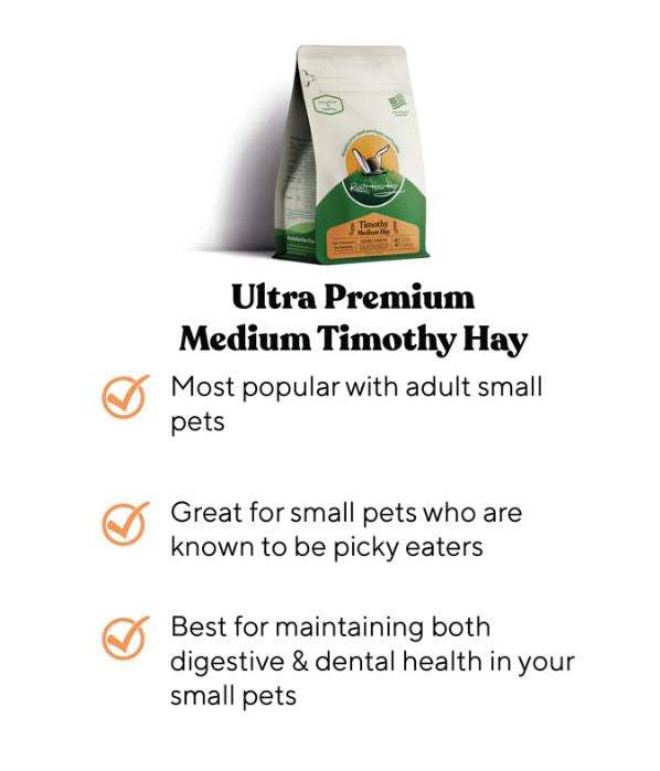 Medium Timothy Hay is a softer hay that has thinner stems and larger leaves, making it easier for small pets to eat. It’s particularly good for aging rabbits as it’s on the softer side, but still meets the nutrition requirements to maintain their dental and digestive health.